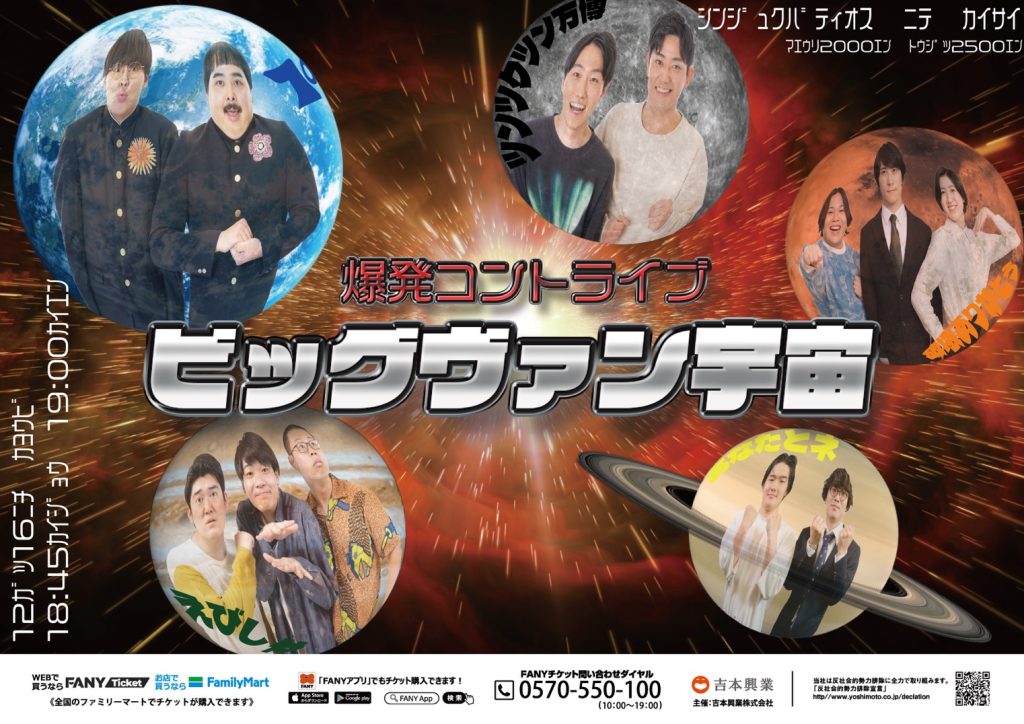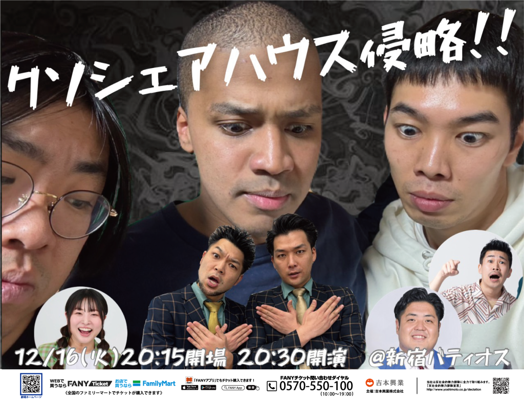 ●新ネタ漫才バトルライブ「ゴールドラッシュ」 12月16日(火)15:00開場/15:15開演 出演:ボブのコーラ、女優、私東京、ド天国、ハンマラッソ、ガングリオン(サンミュージック)、つめたいごはん(マセキ芸能社)、ダブルグッチー(GRAPE COMPANY)、Let Me Show You THEまごころ(GATE)、照山おうちごはん 前売2,000円/当日2,500円 ●伝書鳩のついつい 12月16日(火)16:45開場/17:00開演 出演:伝書鳩、照山おうちごはん 前売1,800円/当日2,300円 ●爆発コントライブ『ビッグヴァン宇宙』 12月16日(火)18:45開場/19:00開演 出演:ぺ、ツンツクツン万博、えびしゃ、破壊ありがとう、あなたとネ 前売2,000円/当日2,500円 ●クソシェアハウス侵略!! 12月16日(火)20:15開場/20:30開演 出演:生ファラオ、豆鉄砲、センチネル、ポテトカレッジ 前売2,000円/当日2,500円 |