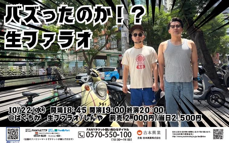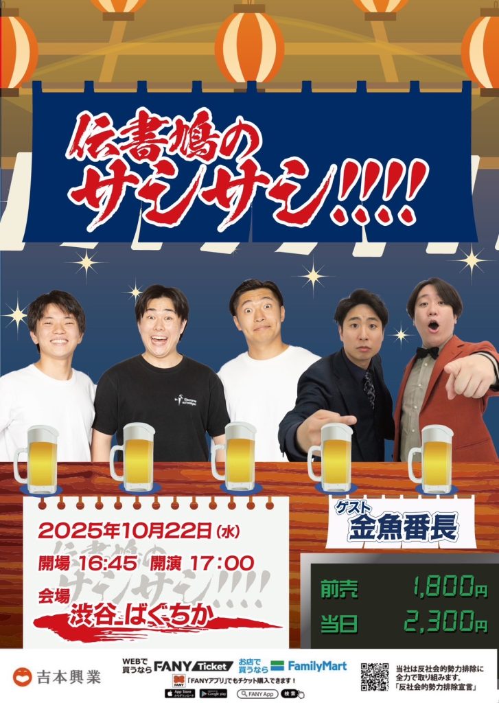 ●伝書鳩のサシサシ!!!! 10/22(水)16:45開場/17:00開演 出演:伝書鳩、金魚番長 チケット:整理番号付自由席 前売1,800円/当日2,300円 一般発売:9/25(木)10:00 ●バズったのか!?生ファラオ 10/22(水)18:45開場/19:00開演 出演:生ファラオ、しんや チケット:整理番号付自由席 前売2,000円/当日2,500円 一般発売:9/25(木)10:00 ●これはシンクロニシティのネタ及びトークライブです 10/22(水)20:30開場/20:45開演 出演:シンクロニシティ チケット:整理番号付自由席 前売1,800円/当日2,000円 一般発売:9/29(月)10:00 |