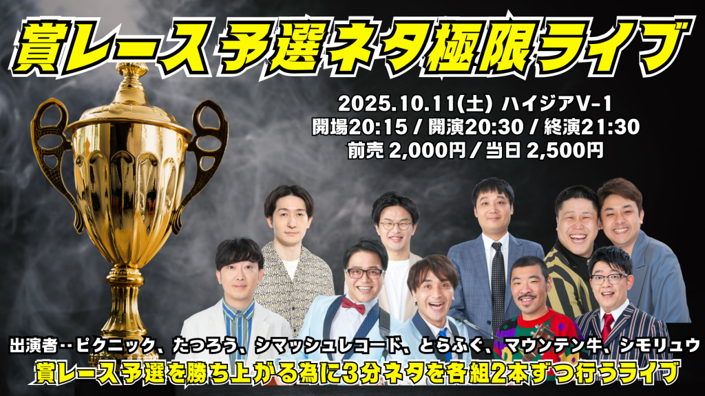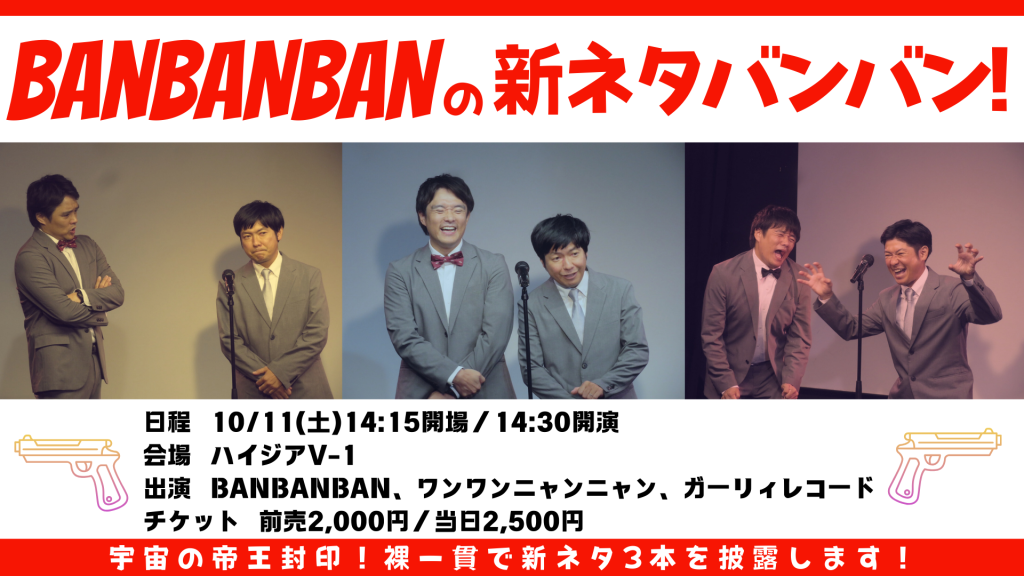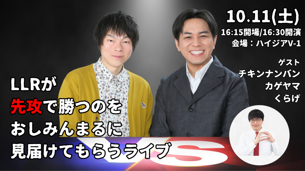 ●BANBANBANの新ネタバンバン! 10月11日(土)14:15開場/14:30開演 出演:BANBANBAN、ワンワンニャンニャン、ガーリィレコード 整理番号付自由席 前売:2,000円 当日:2,500円 一般発売:9/25(木)10:00 ●LLRが先攻で勝つのをおしみんまるに見届けてもらうライブ 10月11日(土)16:15開場/16:30開演 出演:LLR、おしみんまる、チキンナンバン、カゲヤマ、くらげ 整理番号付自由席 前売:2,000円 当日:2,500円 一般発売:9/25(木)10:00 ●ネタとリアクション 10月11日(土)18:15開場/18:30開演 出演:とらふぐ、他 整理番号付自由席 前売:2,000円 当日:2,500円 一般発売:9/30(火)10:00 ●賞レース予選ネタ極限ライブ 10月11日(土)20:15開場/20:30開演 出演:ピクニック、たつろう、シマッシュレコード、とらふぐ、マウンテン牛、シモリュウ 整理番号付自由席 前売:2,000円 当日:2,500円 一般発売:9/25(木)10:00 |
