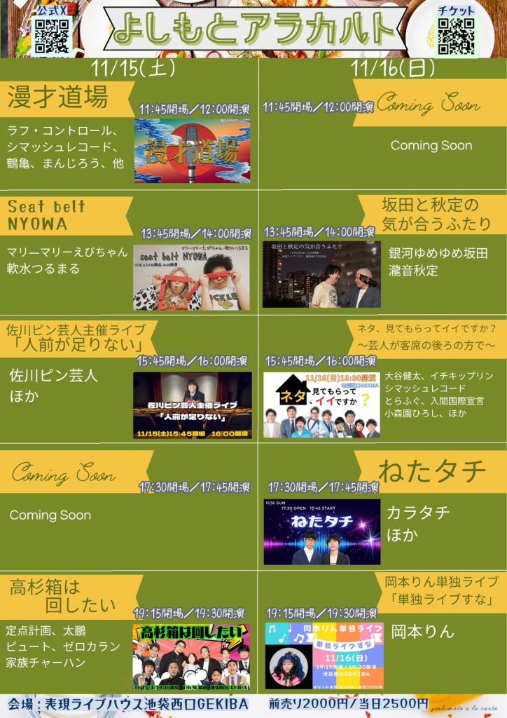 ①漫才道場 11/15(土)11:45開場/12:00開演 出演:ラフ・コントロール、シマッシュレコード、鶴亀、まんじろう、他 チケット:整理番号付自由席 前売2,000円/当日2,500円 ②seat belt NYOWA 11/15(土)13:45開場/14:00開演 出演:マリーマリーえびちゃん、軟水つるまる ゲスト:ビューティフルトーキョーマンズ笹本、シンクロニシティ西野、そいそ〜すカメオ、プリズンクイズチャンネル竜大、センチネルトミサット(太田プロダクション) チケット:整理番号付自由席 前売2,000円/当日2,500円 ③佐川ピン芸人主催ライブ「人前が足りない」 11/15(土)15:45開場/16:00開演 出演:佐川ピン芸人、他 チケット:整理番号付自由席 前売2,000円/当日2,500円 ④山田のトークライブ「お客さん、少し話せる?」 11/15(土)17:30開場/17:45開演 出演:山田愛実 チケット:整理番号付自由席 前売2,000円/当日2,500円 ⑤高杉箱は回したい 11/15(土)19:15開場/19:30開演 出演:定点計画、太鵬、ピュート、ゼロカラン、家族チャーハン チケット:整理番号付自由席 前売2,000円/当日2,500円 ⑥坂田と秋定の気が合うふたり 11/16(日)11:45開場/12:00開演 出演:銀河ゆめゆめ坂田、滝音秋定 チケット:整理番号付自由席 前売2,000円/当日2,500円 ⑧ネタ、見てもらってイイですか?~芸人が客席の後ろの方で~ 11/16(日)15:45開場/16:00開演 出演:大谷健太、イチキップリン、シマッシュレコード、とらふぐ、入間国際宣言、小森園ひろし、他 チケット:整理番号付自由席 前売2,000円/当日2,500円 ⑨ねたタチ 11/16(日)17:30開場/17:45開演 出演:カラタチ、他 チケット:整理番号付自由席 前売2,000円/当日2,500円 ⑩岡本りん単独ライブ「単独ライブすな」 11/16(日)19:15開場/19:30開演 出演:岡本りん チケット:整理番号付自由席 前売2,000円/当日2,500円 |