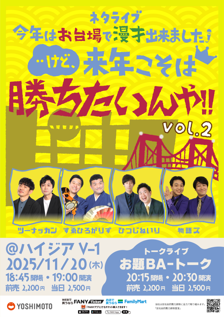 ●ネタライブ「今年はお台場で漫才出来ました!‥けど、来年こそは勝ちたいんや!!vol.2」 11月20日(木)開場18:45/開演19:00 整理番号付自由席 前売2,200円/当日2,500円 ツーナッカン、すゑひろがりず、ひつじねいり、物語ズ ●トークライブ「お題BA-トーク」 11月20日(木)開場20:15/開演20:30 整理番号付自由席 前売2,200円/当日2,500円 ツーナッカン、すゑひろがりず、ひつじねいり、物語ズ |