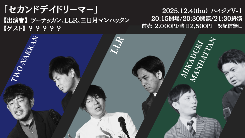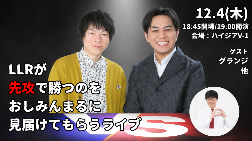●LLRが先攻で勝つのをおしみんまるに見届けてもらうライブ 12月4日(木)18:45開場/19:00開演 出演:LLR、おしみんまる、グランジ、他 前売:2,000円 当日:2,500円 ●セカンドデイドリーマー 12月4日(木)20:15開場/20:30開演 出演:ツーナッカン、LLR、三日月マンハッタン、他 前売:2,000円 当日:2,500円 |