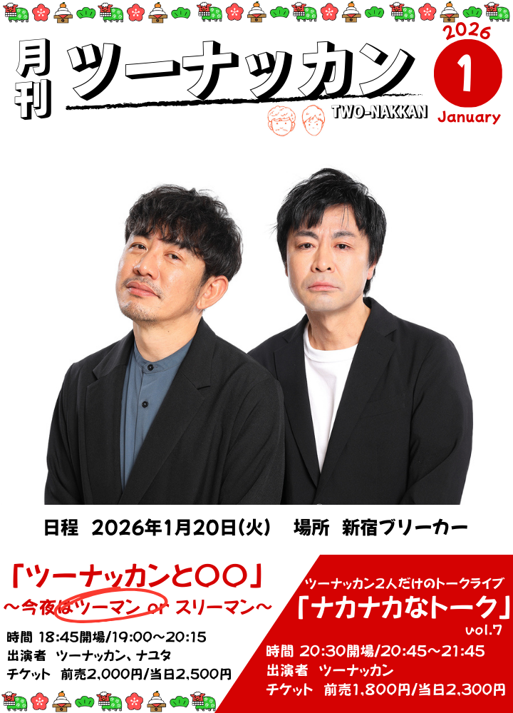 ●月刊ツーナッカン~今夜はツーマン~ 2026年1月20日(火)18:45開場/19:00開演 出演:ツーナッカン、ナユタ 前売2,000円/当日2,500円 ●月刊ツーナッカン~ナカナカなトークvol.7~ 2026年1月20日(火)20:30開場/20:45開演 出演:ツーナッカン 前売1,800円/当日2,300円 |